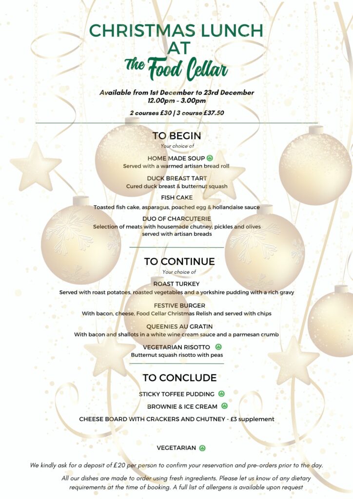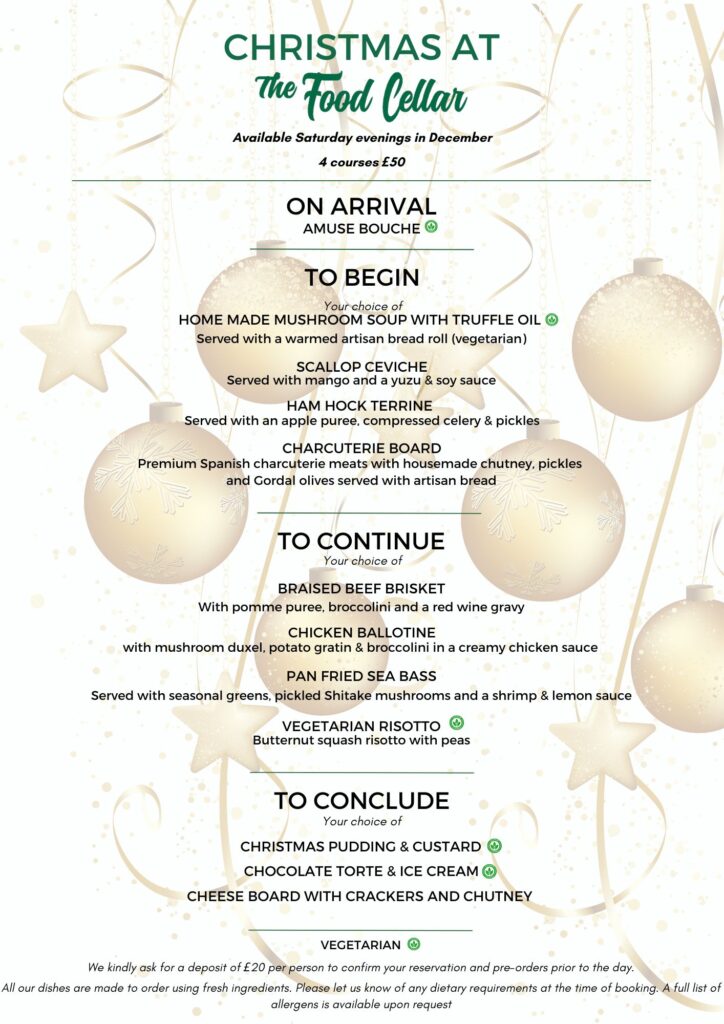 Get ready for a magical December at The Food Cellar! On Saturday 6th, 13th & 20th December, join us from 6:45pm for a four-course festive feast that’s perfect for celebrating with family, friends or colleagues.