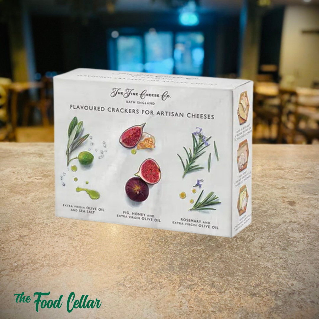 The perfect partners cheese. Contains individual packs of Extra-Virgin Olive Oil and Sea Salt, Fig, Honey and Extra-Virgin Olive Oil, and Rosemary and Extra-Virgin Olive Oil crackers.